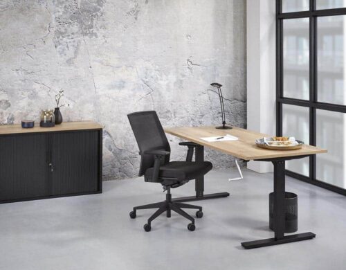 - Onderstel: zit-sta bureau onderstel met slinger in neutrale kleuren zoals wit, zwart of grijs.