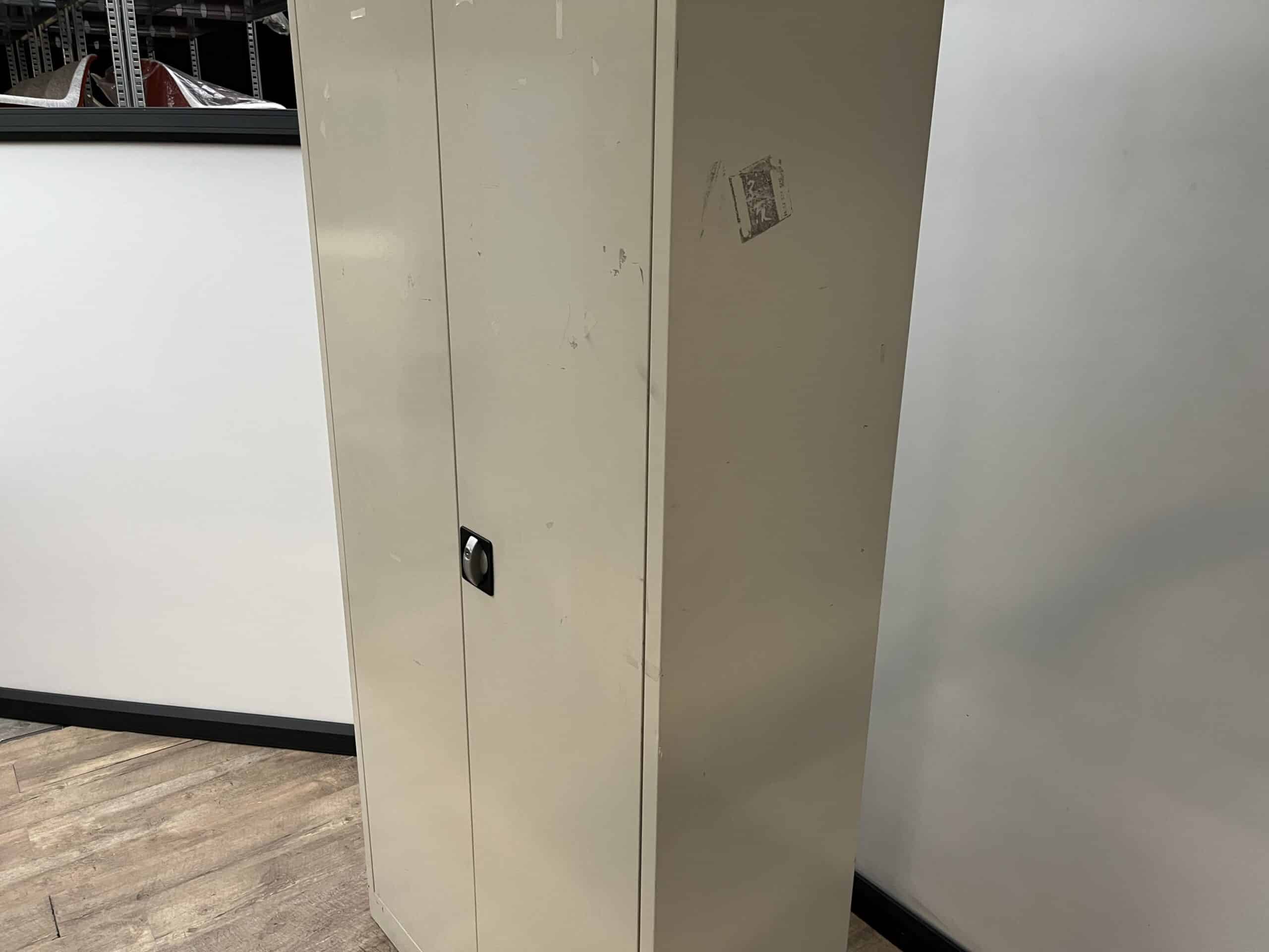 Licht grijze draaideurkast van 195 x 92 x 42 centimeter deze draaideur kast heeft 4 in hoogte verstelbare legborden. Deze legborden zijn niet alleen verstelbaar maar kunt u er ook uit pakken, op deze manier kunt u ook spullen van een groter formaat gemakkelijk op bergen in deze kast. Deze kast voorzien van een draaisluiting hiermee kunt u de kast afsluiten, ook kan je kast afsluiten met een sleutel. Dit is een gebruikte kast en heeft dus gebruikssporen, zou deze kast een tweede leven kunnen krijgen in uw kantoor, garage of werkplaats?