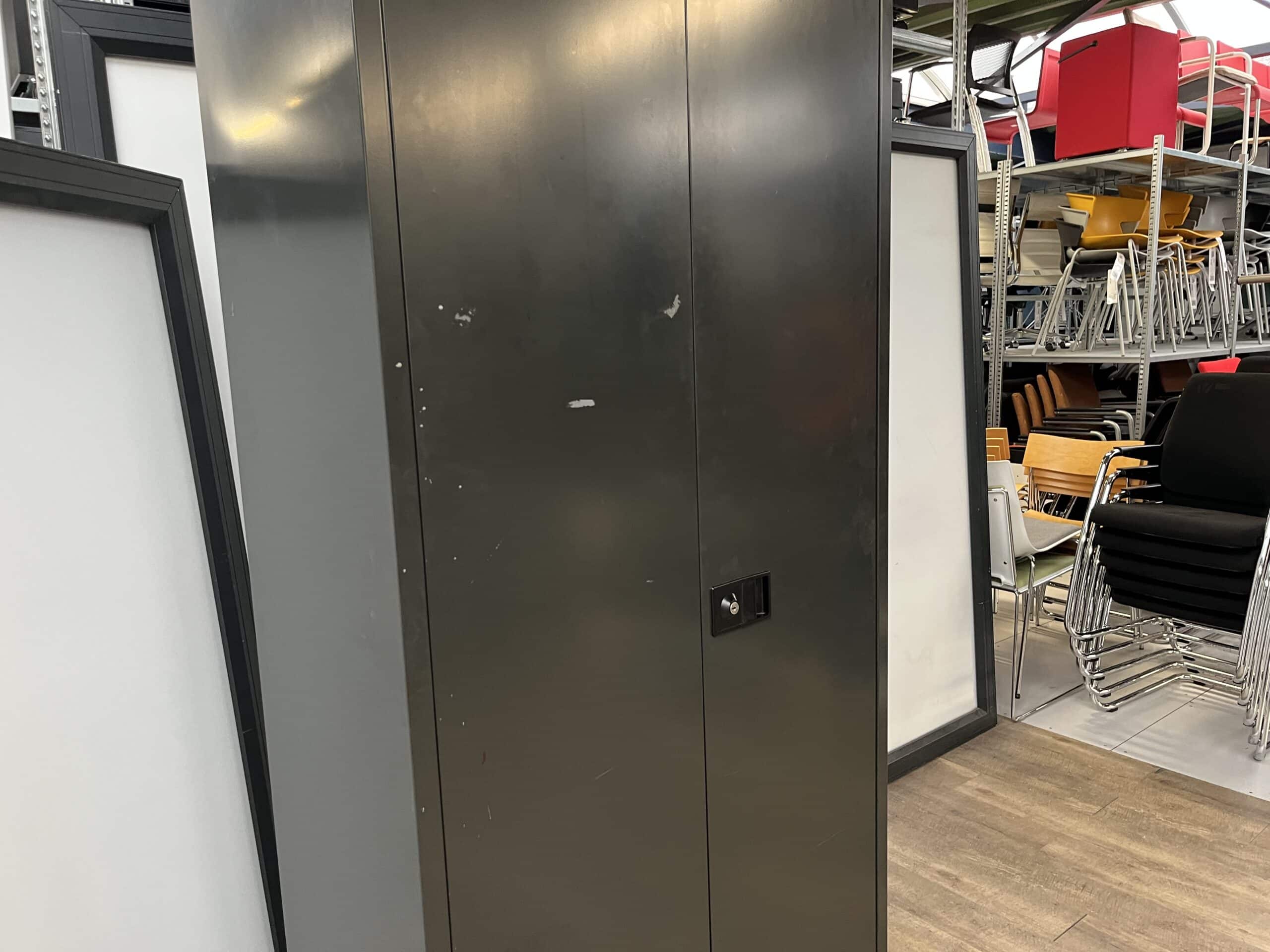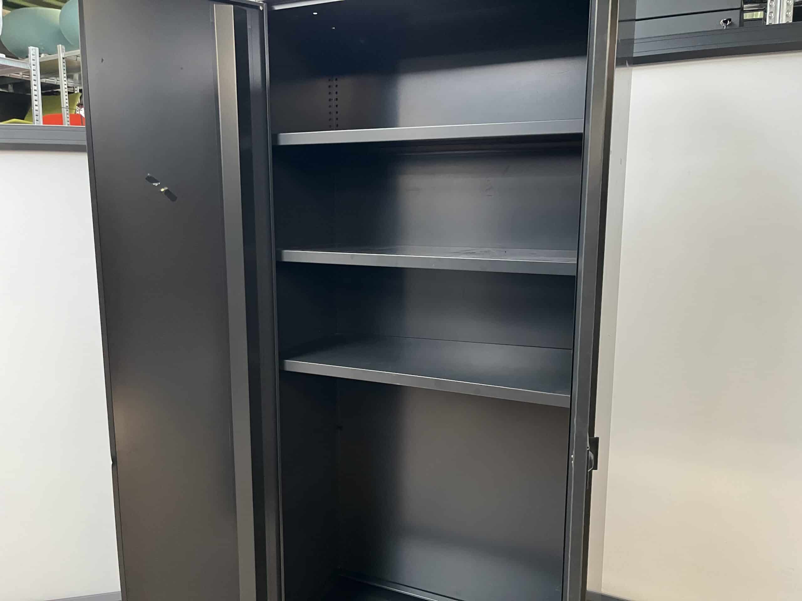 Zwart draaideurkast van 195 x 92 x 42 centimeter deze draaideur kast heeft 4 in hoogte verstelbare legborden. Deze legborden zijn niet alleen verstelbaar maar kunt u er ook uit pakken, op deze manier kunt u ook spullen van een groter formaat gemakkelijk op bergen in deze kast. Deze kast voorzien van een draaisluiting hiermee kunt u de kast afsluiten, let op bij deze kast wordt geen sleutel meegeleverd. Dit is een gebruikte kast en heeft dus gebruikssporen, zou deze kast een tweede leven kunnen krijgen in uw kantoor, garage of werkplaats?